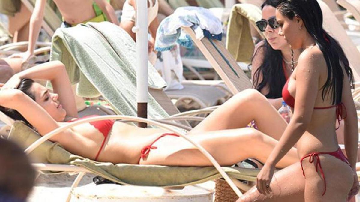 - Kırmızı bikinisi ile fit görünümlü beach tatil rahatlığı